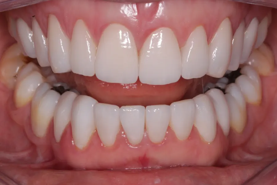 Restauração completa do sorriso com coroas fixadas em implantes dentários.